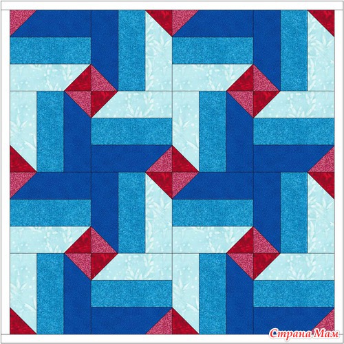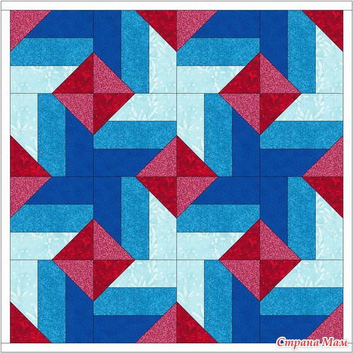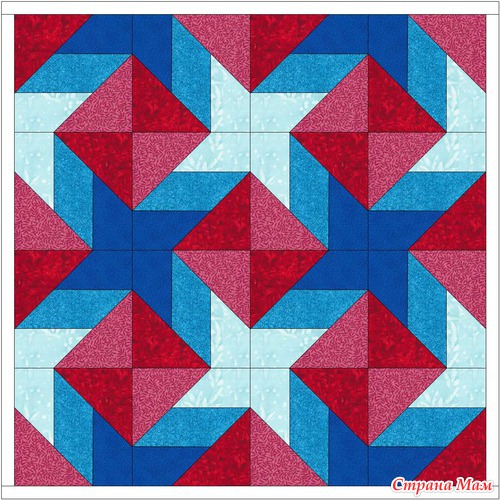 Для красных квадратов она использовала charms - здесь в специализированных магазинах иногда продают такие пачки уже разрезанных и подобранных по цвету тканей. Сторона квадрата 5 дюймов, это 12,75 см.