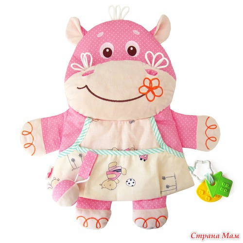Основное назначение Бегемоти – хранить и держать под рукой самые необходимые вещи малыша, будь то игрушка, соска, бутылочка, и создавать благоприятный эмоциональный фон в детской. Бегемотю можно привязывать к спинке кроватки как с внешней, так и с внутренней стороны, а впоследствии использовать как настенную игрушку-панно.