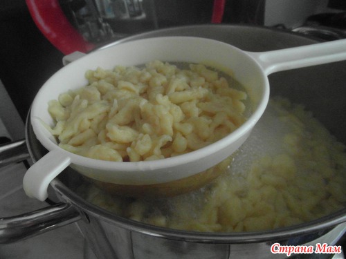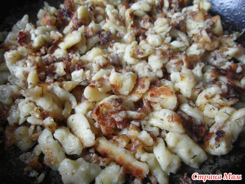 Тесто никак не хотело проваливаться в дырочки дуршлага, и мне ничего не оставалось сделать, как маленькими порциями вручную сделать галушки, и сварить их. Обжарила их в топленом масле, вот сейчас буду есть.