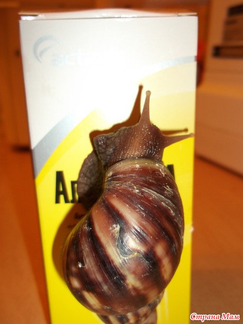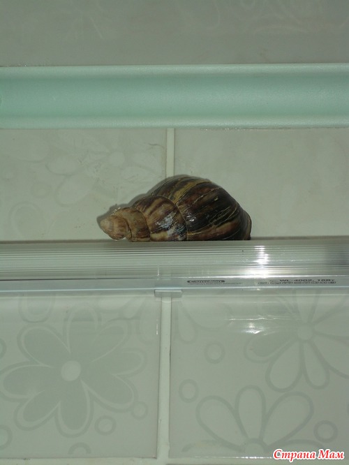 Сейчас Герасим усердно пожирает зелень, овощи и кальций. Весит 250 грамм примерно, длина раковины - с хозяйскую ладонь. Любит в скайпе строить глазки малолетним вертихвосткам.