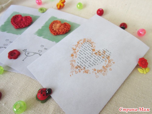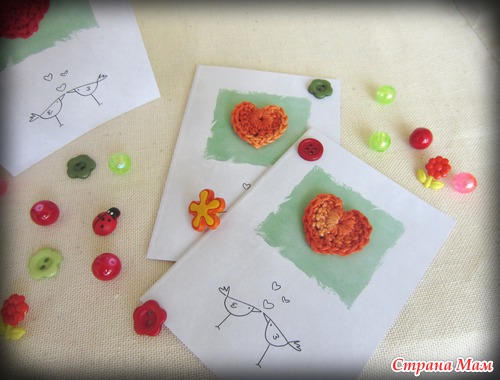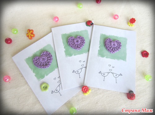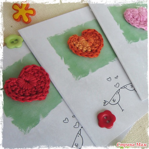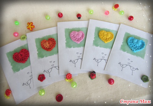 Миниатюрные открытки, выполненные в стиле "цифровой скрапбукинг" с элементами handmade - разноцветными вязаными сердечками.