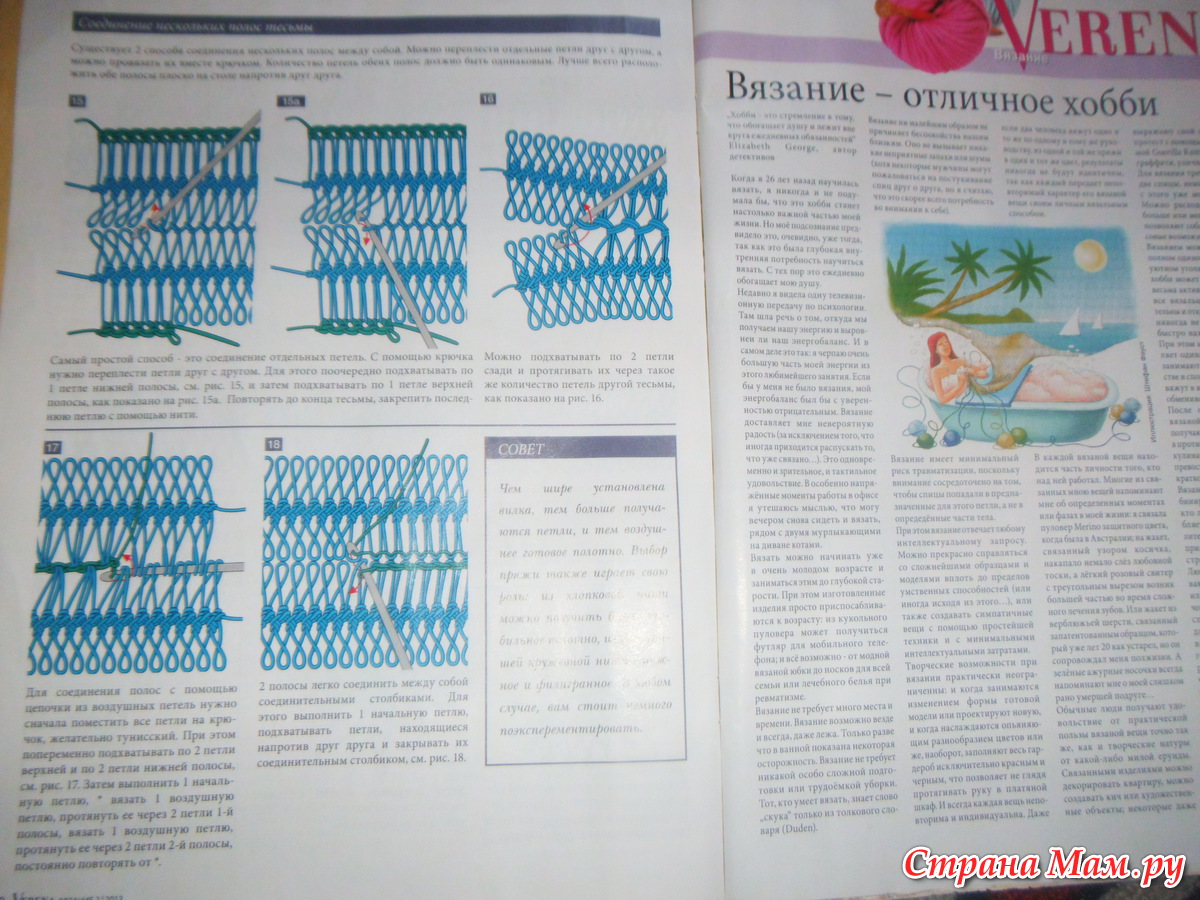 Для соединения полос с помощью цепочки из воздушных петель нужно сначала поместить все петли на крючок, желательно тунисский. При этом попеременно подхватывать по 2 петли верхней и по 2 петли нижней полосы, см. рис. 17. Затем выполнить 1 начальную петлю, * вязать 1 воздушную петлю, протянуть ее через 2 петли 1-й полосы, вязать 1 воздушную петлю, протянуть ее через 2 петли 2-й полосы, постоянно повторять от *.