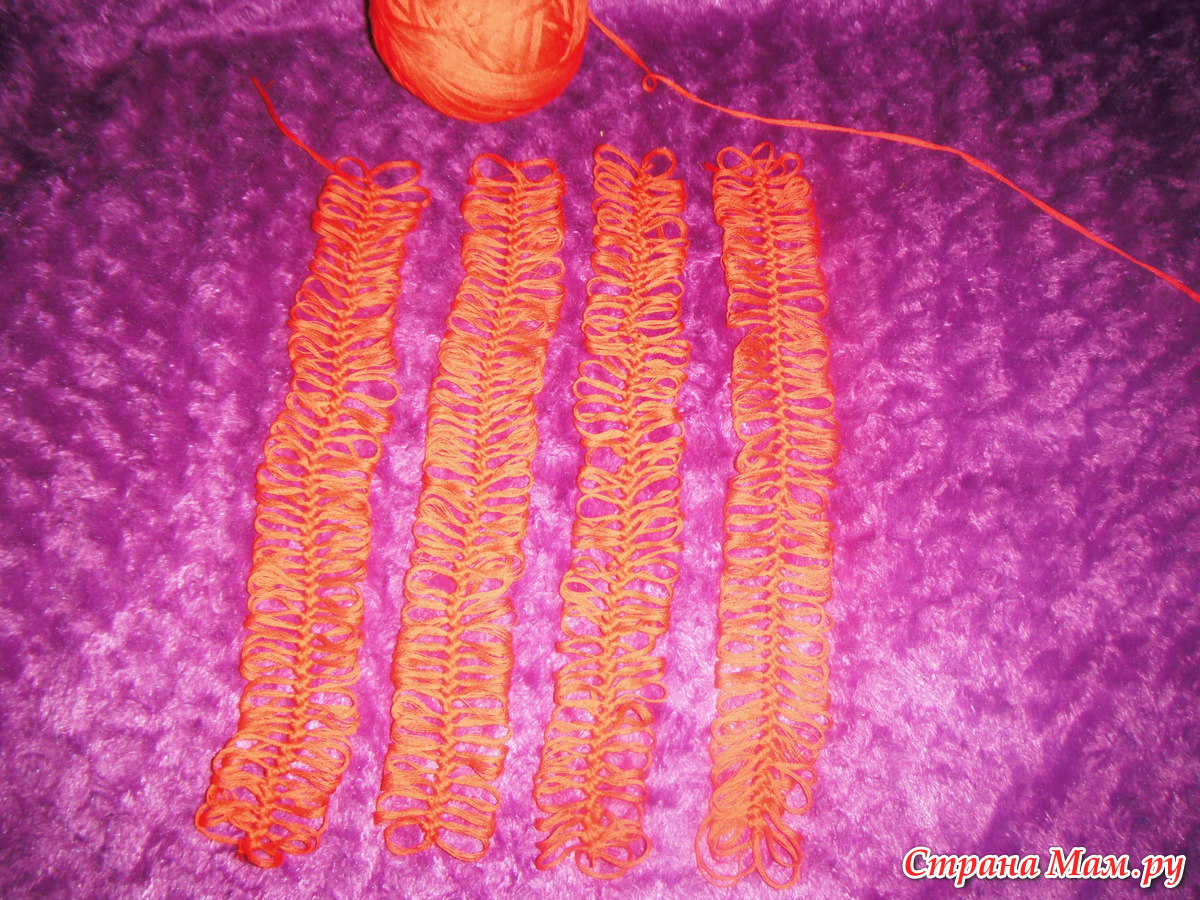 Далее я связала на вилке четыре полосы чуть больше 40 см каждая, остались еще две в 100 см, чуть больше сделаю на пару тройку см