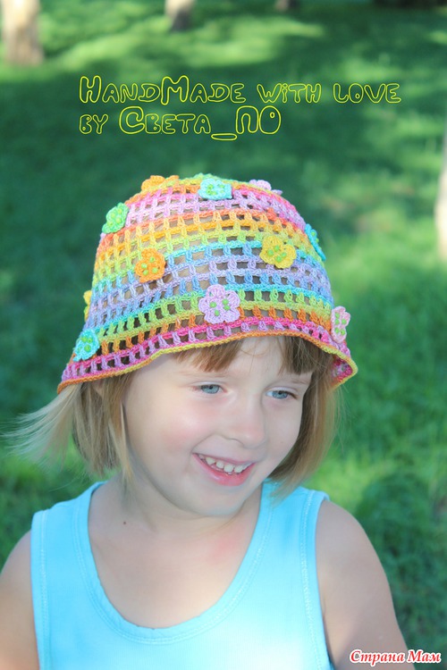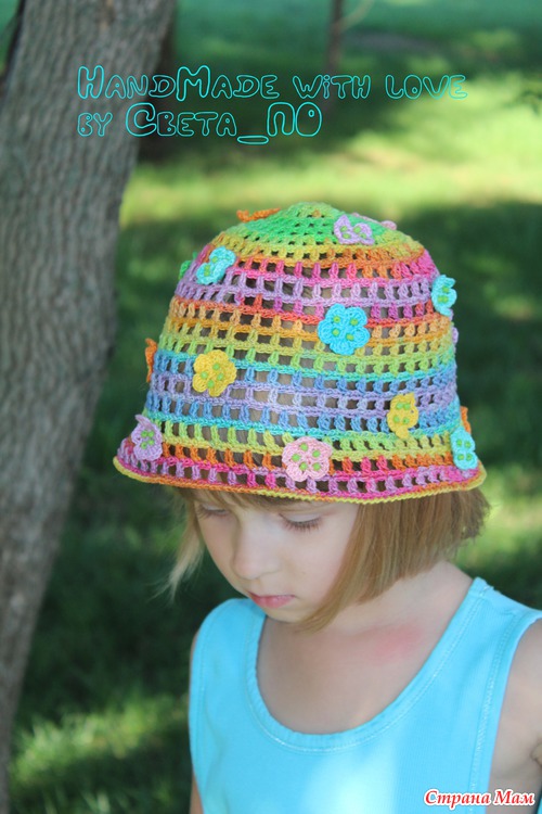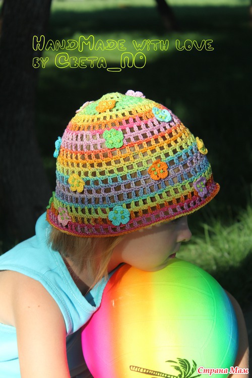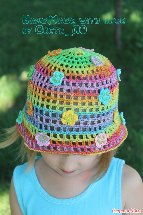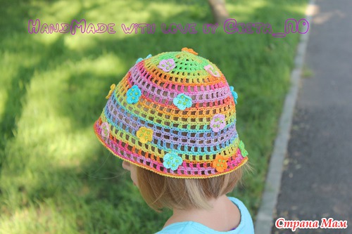 Цветочки разных оттенков (по схеме от этой панамки https://www.stranamam.ru/post/5852861/) пришиты с салатовыми бусинками.