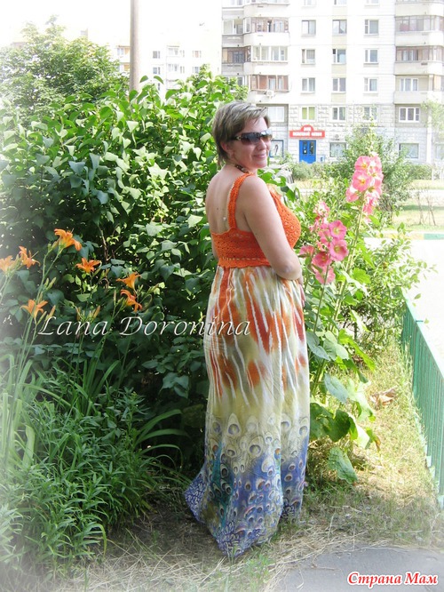 Недавно закончила свой новый сарафан, уже и выгулять успела несколько раз, а сфотографировать все некогда или некому. Все разъехались, кто куда, в том числе и муж - уехал на рыбалку с фотоаппаратом. Пришлось попросить коллегу на работе провести фотосессию. А то девочки здесь просят хвастик показать, а я все тяну и тяну с ним. Итак, сначала фото, потом много букав.