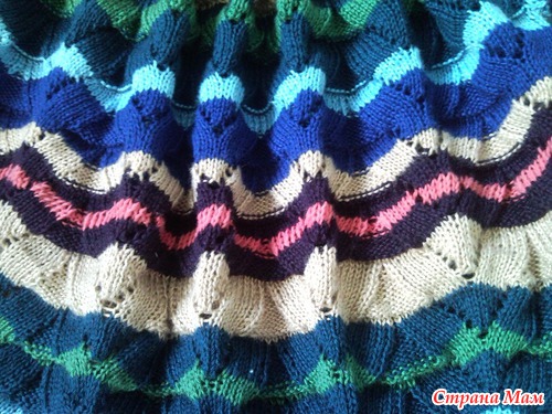 Оказалось, что реально работа идет медленно… но весело! Получалось эдакое полотно объемом с парашют, веселенькой раскраски… размером на слона. Если стянуть – оно ложилось красивыми волнами… но ляжет ли в готовом изделии? А уж сама проблема выбора фасона… там на картинке было ориентировочное платье, у него вроде бы вкруговую вязано снизу-вверх полотнище, а потом в районе проймы присобачены типа реглана такие же складчатые рукава (все на круговых спицах) и на уровне шеи все это собирается на полоску-воротник. Но. Модель то у меня детская, да и думать надо было как так сделать, чтобы изящненько подойти к вороту.