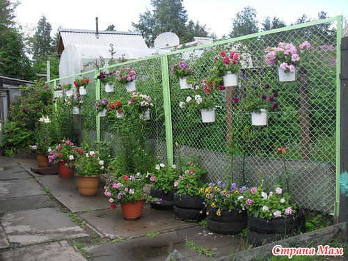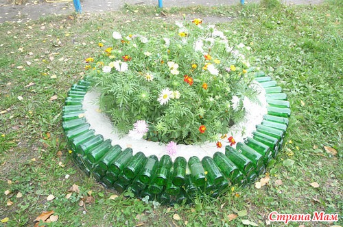 я из оставшейся после ремонта кафельной плитки делала ограждение для цветов, типа как на фотке из пластиковых бутылок, у нас её много было и разноцветная, так красиво получилось.