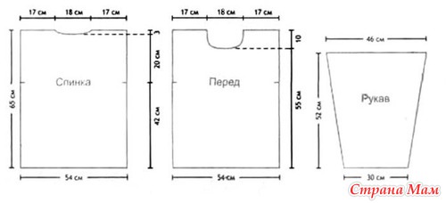 Перед. Вязать как спинку. На высоте 55 см от начала вязания закрыть для выреза горловины цен тральные 20 п., по обе стороны от них в каждом р. 2 раза по 2 п. и 3 р. по 1 п. На общей высоте 65 см закончить вязание.