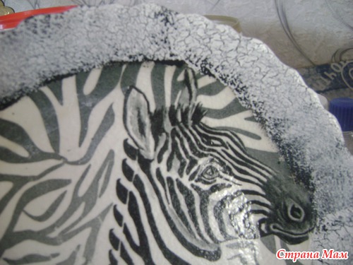 Кода все просохнет. Берем черную краску и губкой закрашиваем белый ободок вокруг зебры