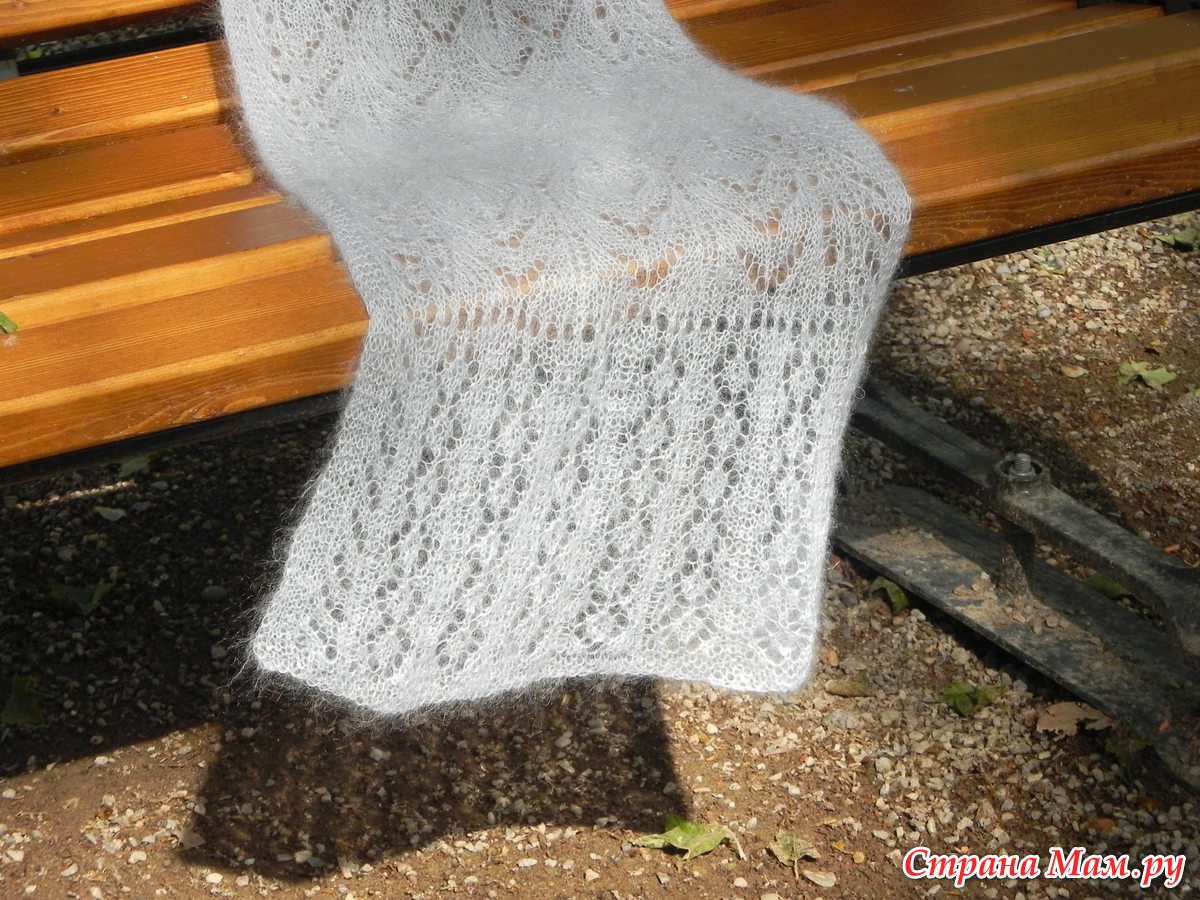 Моя первая работа из кидсилка (этот фирмы AUSTERMANN). На палантин размером 46 см на 156 см ушло всего лишь 50 г (т. е. два клубка по 25 г, 225 м в каждом). Получился он при всей своей воздушности оч. теплым. Вязала спицами №3, но, видимо, надо было выбирать на полразмера больше, но поскольку опыта работы с такой пряжей не было, имеем, что имеем. Местами, мне кажется, рисунок все же "забит".