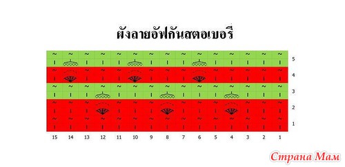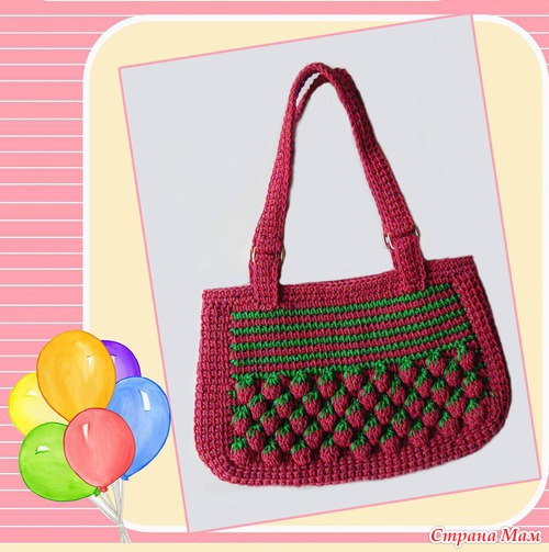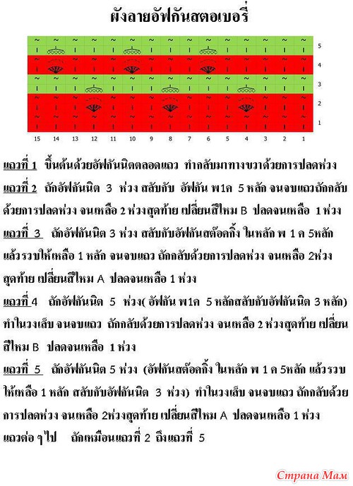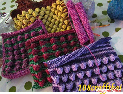 Последнее условное обозначение дано для 3-х тунисских ст. б/н, а у нас их 5 и захватывать их нужно, как на предпоследнем условном обозначении. См. 3-е изображение первого фото из поста. Зелёная нить. Связали 5 тунисских ст.б/н над клубничкой и тут же (в прямом ряду) их закрыли