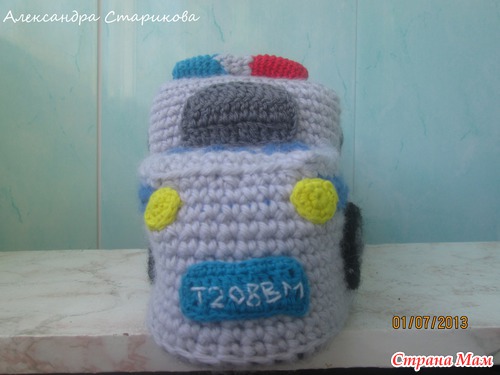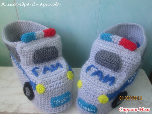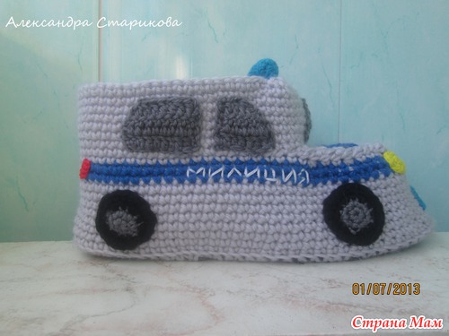У моей хорошей знакомой папа работал в ГАИ. Лет 10 назад он благополучно вышел на пенсию. Дабы порадовать папу в профессиональный праздник, знакомая попросила связать ему тапочки, которые напоминали бы ему о его службе в тогда еще милиции