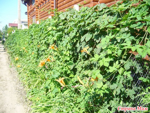 Сам забор - простая сетка рабица. Заросший хмелем и лилейниками, он подчеркивает природную красоту сруба