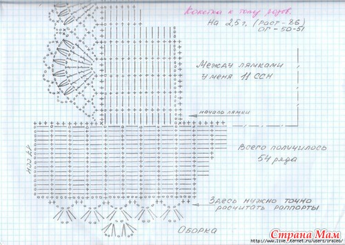 Вяжу из Ализе мисс, на кокетке крючок 1,2 (хотя получается плотн, можно взять крючок по-больше), первый три ряда юбки связаны этим же крючком, затем увеличила до 1,4. Расширение юбки буду делать за счет увеличения ССН в арках и сменой крючка.