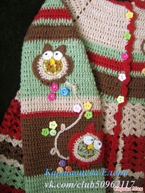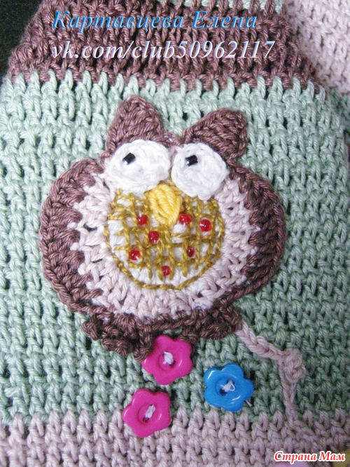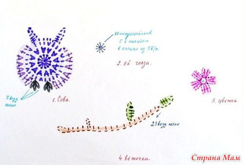 Пряжа СОСО, ушло ровно четыре целых мотка и по чуть-чуть для декорации. крючок 1,5,2. Схем, как таковых нет, смотрела по картинкам, да и сложного нет ничего в схемах. Шляпку вязала, придумывая на ходу, основной рисунок - скрещенные столбики с накидом. Ну а вот схемкой совушек поделюсь, правда я немножко ее изменяла.