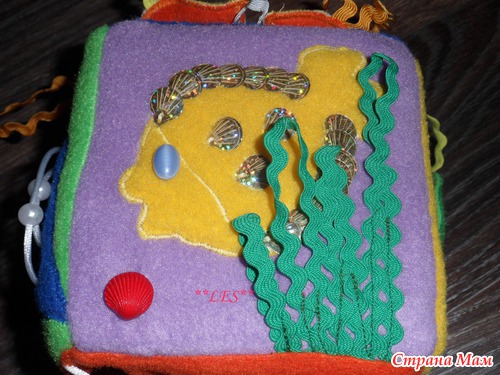 4. Сторона с рыбкой. Можно трогать бусины, паетки, дергать тесьму-водоросли.