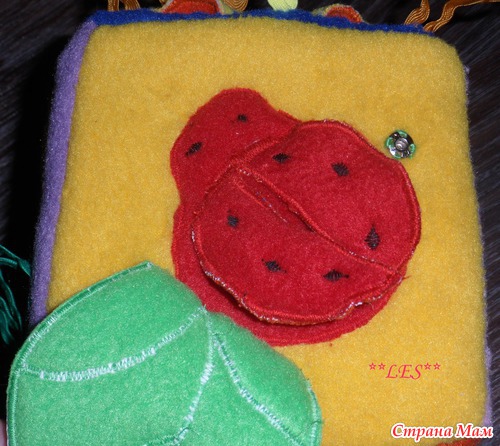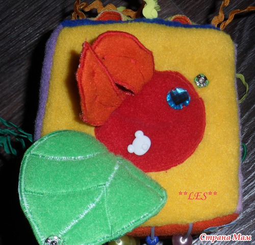 5. Сторона с листочком. Листочек крепится на кнопку. Под ним божья коровка, её крылышки раскрываются, под ними мордочка медвежонка и бусина.