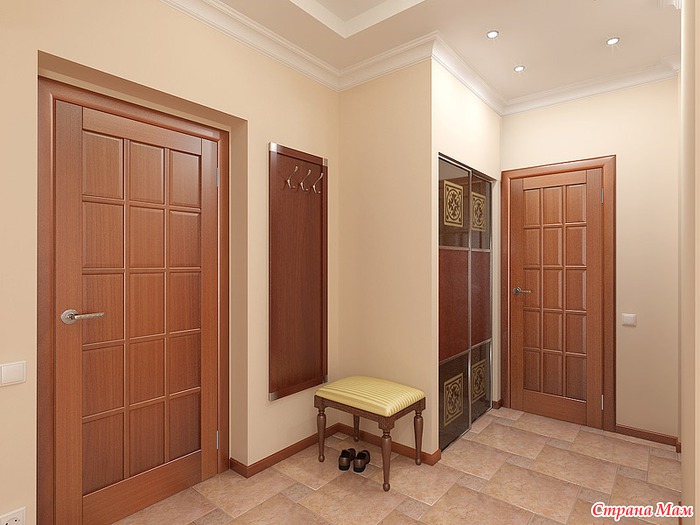 В прихожих обычно недостаточно света, поэтому оптимальные цвета стен и потолка в них должны быть светлыми и холодными. Освещение в прихожей лучше сделать ярким, стоит подумать о дополнительном освещении зеркала и о точечных светильниках для шкафа или полок. Зону прямо у входной двери практичнее выкладывать плиткой, ковролин в прихожей не слишком уместен, а линолеум или ламинат нужно выбирать с высокой износостойкостью.
