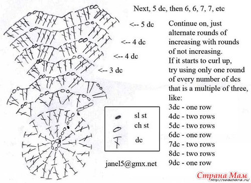 За основу брала вот эту схемку, но постепенно начинала вязать с 2, а потом и с 3 накидами и так до конца
