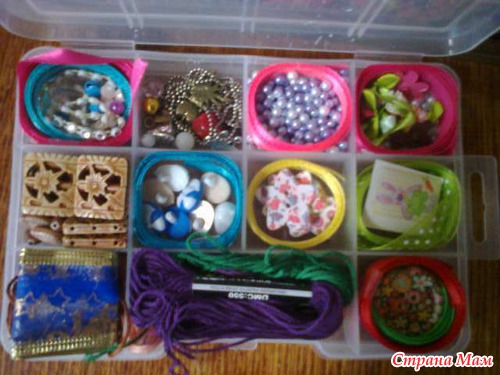 а еще коробулька... в которой и ленточки и пуговички, бусины, подвески, колокольчики, розочки... ииии... очень много всего...