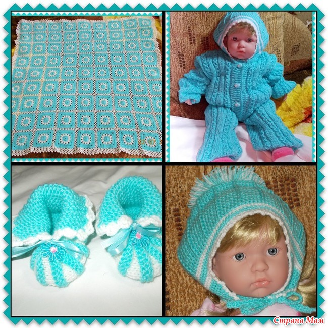 - шапочку, пинетки, комбинезон и пледик. Вязала спицами № 2 и крючком № 2 из ниточекПехорка бисерная (ушло 3 моточка) и Семеновская пряжа Аэлита - около 1 моточка И вот что у меня получилось: