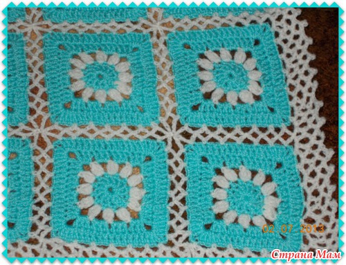 Каждый квадратик (голубой) обвязала возд.петлями ( 5 в.п.), а потом вязалв 2-й квадратик и опять обвязывала белой нитью 5 вод.петлями и сразу соединяла с предыдущим квадратом и так далее. Надеюсь, что понятно написала.
