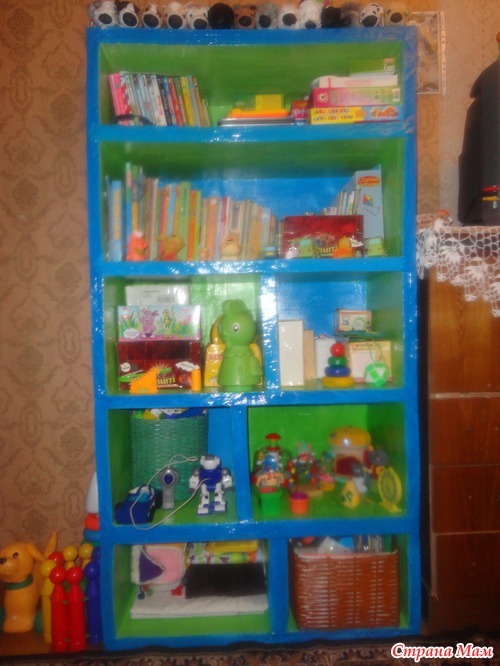 Вот такой шкафчик под игрушки для деток сделала я. Он полностью из картона. Окрашен акриловой краской с колером.
