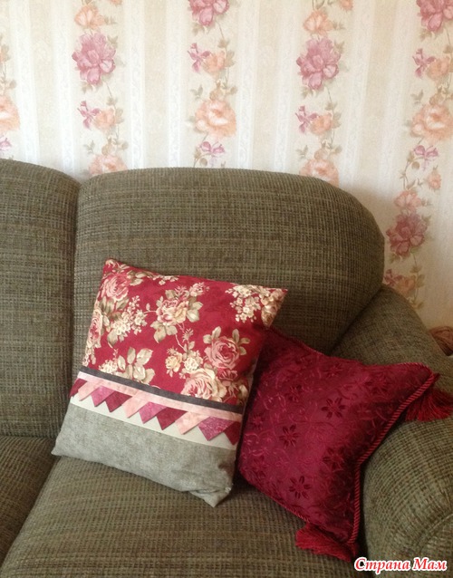 Вот, например, моя диванная подушка, где треугольники из разных тканей добавлены по середине.