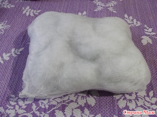 В качестве "начинки" - халафайбер. Взяла мешочек от новой обуви. Боковые швы прошила изгибом и набила наполнителем.