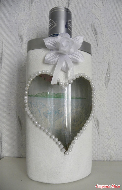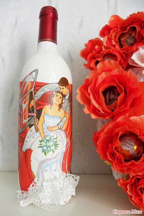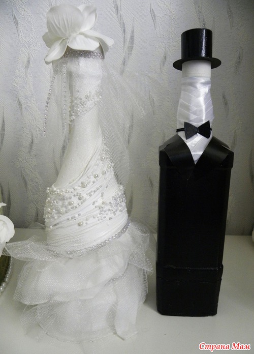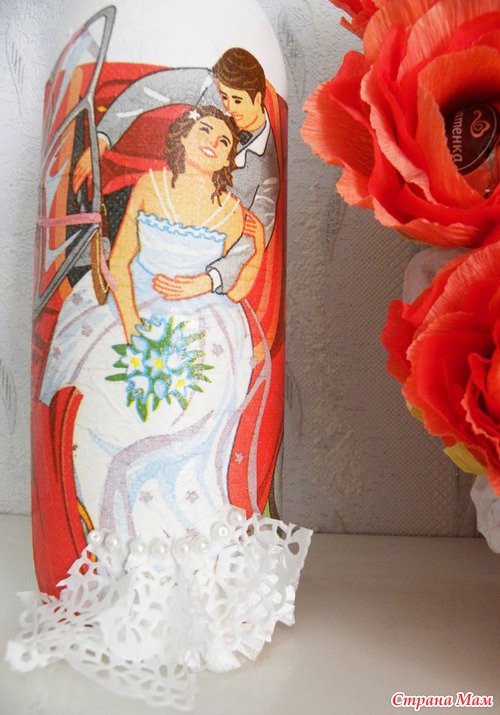 А это сами жених с невестой (правда это уже не декупаж, а скорее всего декор бутылок, но, да простят меня модераторы, решила все вместе разместить )
