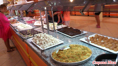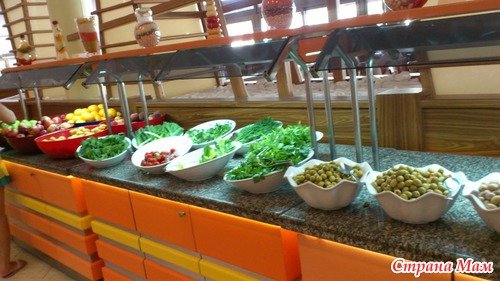 Главный ресторан отеля очень большой и просторный. Мы никогда не ждали когда уберут столик, всегда были свободные:Чем нас кормили: было много чего, мясо - на гриле, кебаб, тефтели, фаршированные овощи, курица - отварная, на гриле, запеченая, индейка, рыба - отварная и жареная на гриле. Гарниры: макароны, спагетти, запеканка из макарон; картофель запеченый, жареный, фри, пюре, отварной в мундире; разнообразные салаты, соленья и маринады, соусы также были представлены очень широко, давали необыкновенно вкусный запеченый с сыром шпинат и цветную капусту.