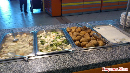 Чем нас кормили: было много чего, мясо - на гриле, кебаб, тефтели, фаршированные овощи, курица - отварная, на гриле, запеченая, индейка, рыба - отварная и жареная на гриле. Гарниры: макароны, спагетти, запеканка из макарон; картофель запеченый, жареный, фри, пюре, отварной в мундире; разнообразные салаты, соленья и маринады, соусы также были представлены очень широко, давали необыкновенно вкусный запеченый с сыром шпинат и цветную капусту.