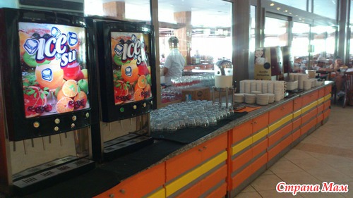 На пляже у моря было два бара, один просто с напитками, во втором с 13 до 17-30 был снек-бар. Что это такое? Это ужасная фаст-фудовская еда: гамбургеры, фри, жареная во фритюре курица с корочкой, пицца (совершенно жуткая), спагетти с соусами, жареные пальчики из лаваша с сыром. Правда был и плюс - можно было перекусить печеньем с молоком или какао.