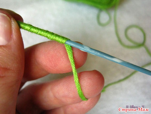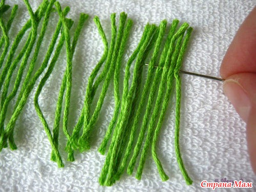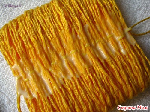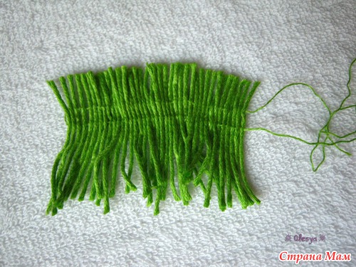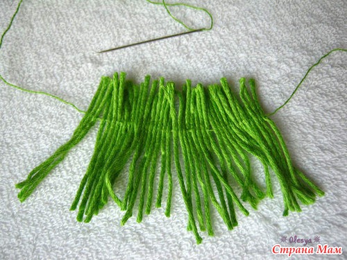Берем тонкую иголку с выдернутой из пряжи ниточкой и нанизываем отрезки на нитку на расстоянии ок. 2/3 длины лепестков