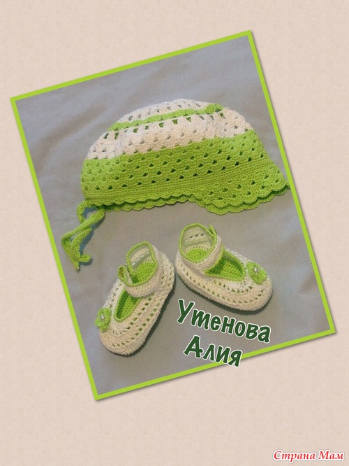 Бандана на возрат 2-6 мес. Ниточки белые Мисс от Ализе, салатовые -Пехорка Успешная, цвет незрелый лимон, крючок 1,5 Кловер, к бандане в довесок связались пинеточки)))