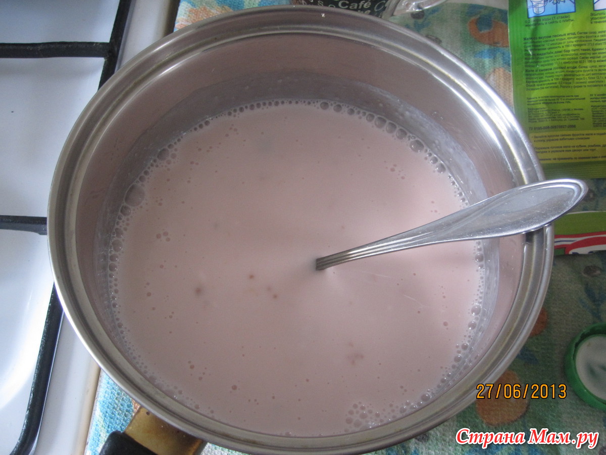 Состав: -3 ст. л. желатина + 1 ст. воды; -0,5 л. сметаны + 1 ст. сахара + ванилин; -клубника (можно банан или киви) Способ приготовления: Желатин залить водой и отставить. Сметану смешать с сахаром и ванилином (именно смешивать, а не взбивать, тогда нежнее и воздушнее получится). Желатин поставить на огонь и постоянно помешивать до однородной массы (до кипения не доводить). Затем влить туда тонкой струйкой сметану, тщательно помешивая.