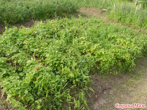 Это клубника. Последний раз пропалываю во время цветения. Потом не пропалываю умышленно, чтобы ягоды были чистые.