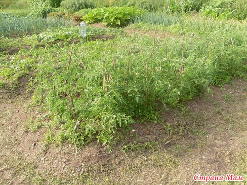 Помидорки. Есть еще баклажаны и перцы, но я вам их не покажу - они еще более ужасно в сорняках выглядят.