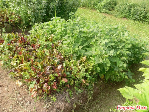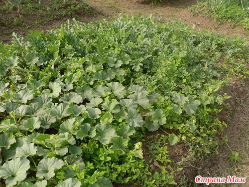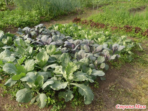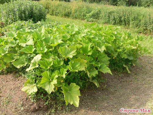 Очень густо посажены патиссоны, кабачки, капуста, ягода (клубника-земляника).