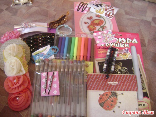 Для девчонок моих ООоооооочень много всего: тут и фломастеры, и ручки гелевые, и и набор для вышивки лентами (вышивать то наверное буду Я), и оооочень много всяких резиночек-заколочек-невидимочека это я не поняла что