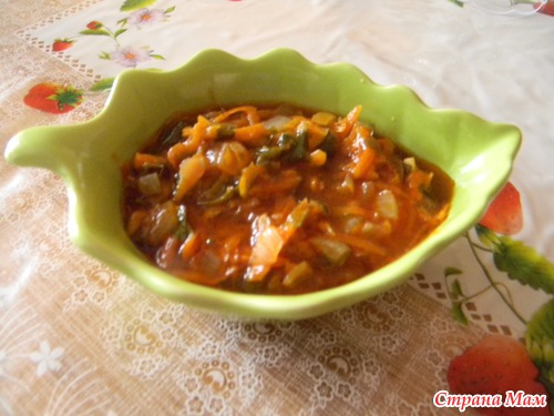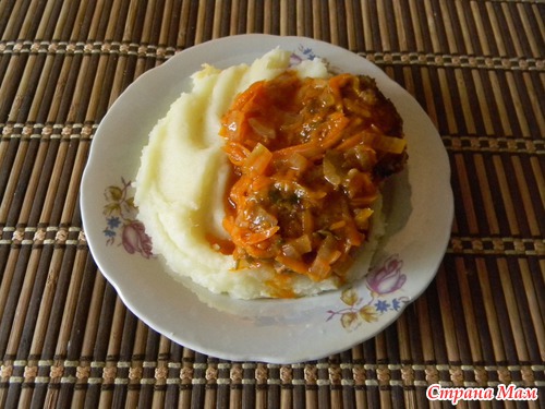 Туда же натёртую на крупной тёрке морковь. Соус томатный. Немного муки для загустения.