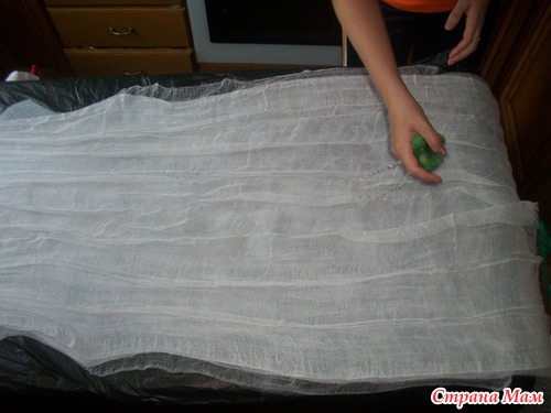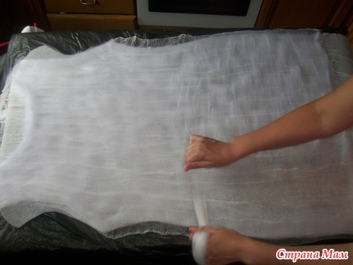 накрываем вторым слоем марли и расправляем по всей поверхности, уделяя внимание проймам и бокам- оставляя припуски из марли