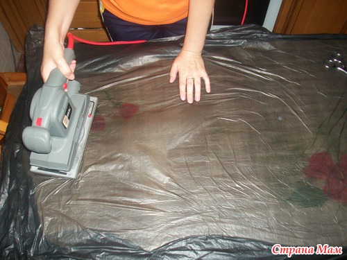 накрываем пленкой и жжужим по всей поверхности буквально по секунде(если нет шлиф-машины, то трем руками