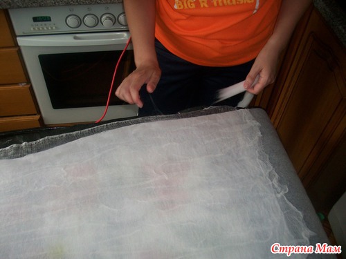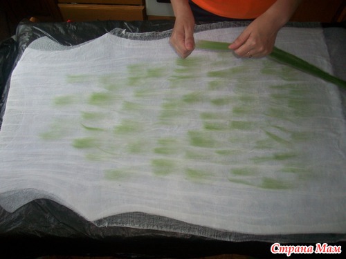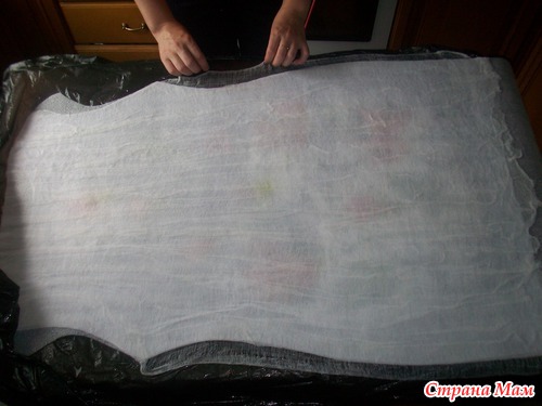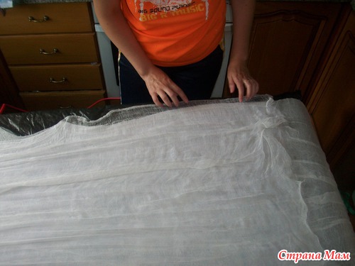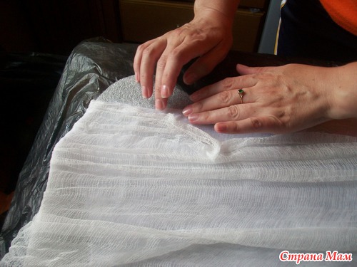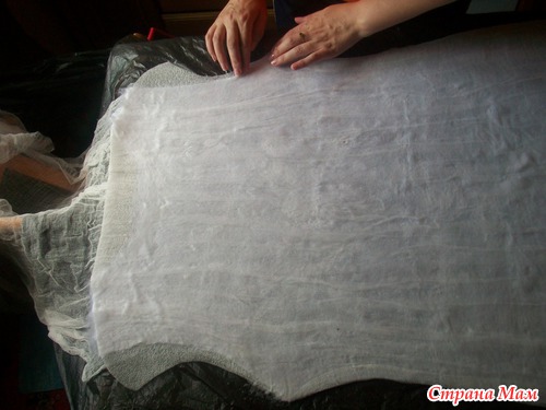 накрываем вторым слоем марли и расправляем по всей поверхности, уделяя внимание проймам и бокам- оставляя припуски из марли