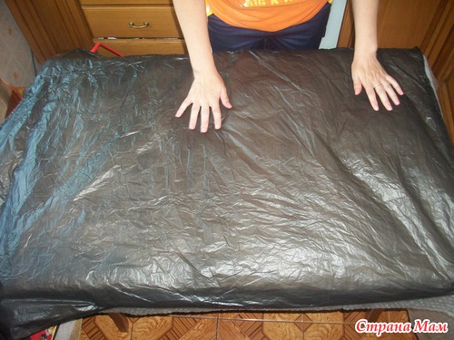 И так приступим: режем 4 метра марли на два одинаковых куска. В начале на выкройку раскладываем первый кусок марли (вверху мы не разрезаем марлю, а просто обернем затем вокруг выкройки) и смачиваем немного, аккуратно расправляем по всей поверхности, особенно в районе пройм, по бокам оставляем припуски из марли, (которые потом будем заворачивать на выкройку, когда перевернем на другую сторону нашу заготовку)