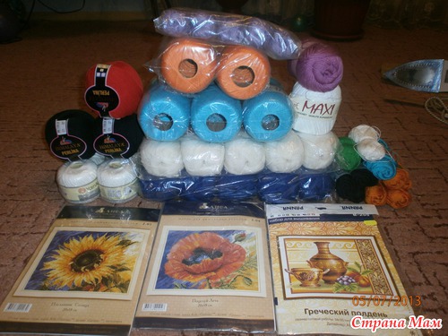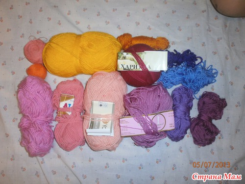 Я нагребла целую гору пряжи.сначала на стол складывали.потом постелили 2 огромных пакета на пол.а я все гребла.гребла...