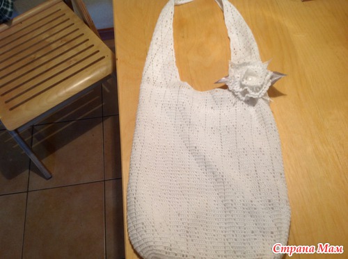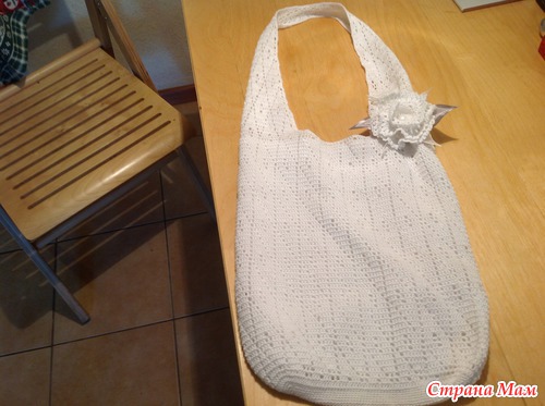 Использовала нитки 100% хлопок, длина примерно в 100гр- около 500 м, крючок кловер № 1,25, расход 1 моток (уж очень!!! захотелось именно тонюсенькую сумку, которая бы плечо не оттягивала...) Получилось вот так: