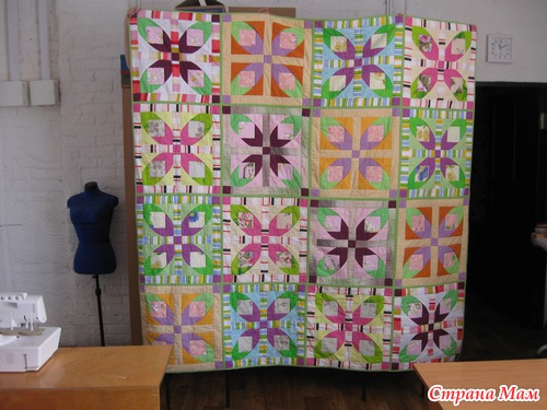Дошила тут одеяло методом двустороннего шитья, без напряга получилось 2,20х2,20. Блок очень простой, шьется легко, в готовом виде 55х55, 16 блоков - и все готово. На обратной стороне тоже какой-то рисунок получился, и главное остатки тканей ушли.