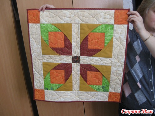 Частичны шитьем собираем полоски вокруг квадрата 11,5х11,5, чтобы получился нижний квадрат, а вокруг две красные и две зеленые полоски. квадраты 14,5х14,,5 заутюживаем в треугольник уголки можно скрепить маленьким кусочком паутинки. Затем на ту же паутинку приклеиваем треугольники в противоположные углы квадрата. Таким образом заготавливаем четыре квадрата. Затем собираем блок используя дополнительно квадратики 6,5х6,5 и полоски шириной 6,5. Когда блок готов отлитные края треугольников отворачиваем, заутюживаем и пришиваем потайными стежками (как в кафедральных окнах).