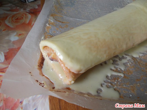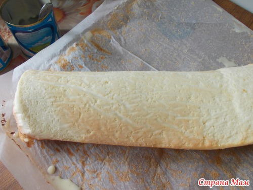 готовый пласт еще горячий смазываем быстро сгущенкой и сворачиваем